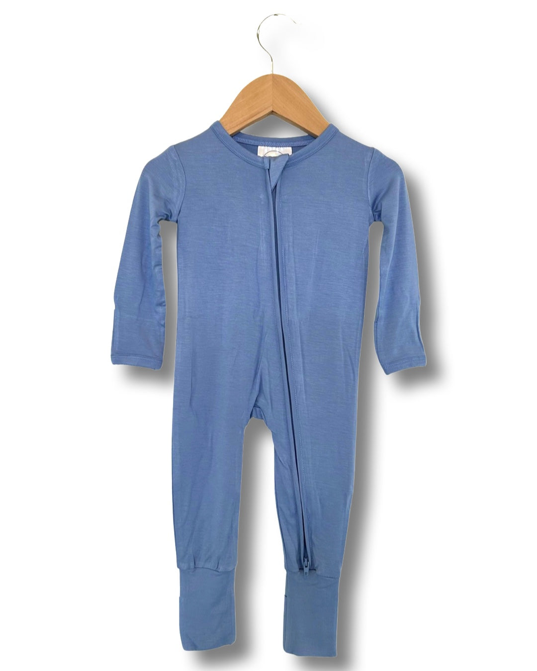 Our buttery soft bamboo zip onesie has fold over mittens for babies feet and hands, keeping them warm all night. They can also be worn without either sets of mittens so babies and toddlers can run around with hands and feet free.