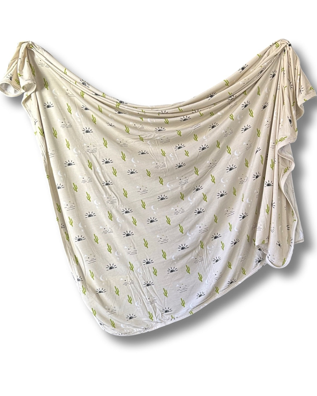 Our buttery soft bamboo swaddle is oversized and stretchy so you can create the perfect swaddle for your baby. It is about 4 feet by 4 feet so you have room to create a knot at the bottom for newborn pictures if wanted.