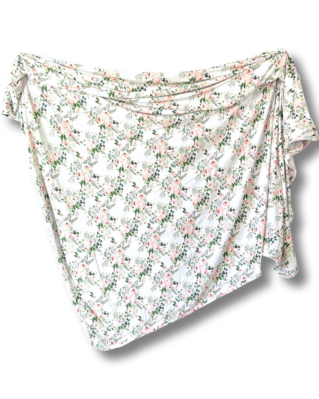 Our buttery soft bamboo swaddle is oversized and stretchy so you can create the perfect swaddle for your baby. It is about 4 feet by 4 feet so you have room to create a knot at the bottom for newborn pictures if wanted.